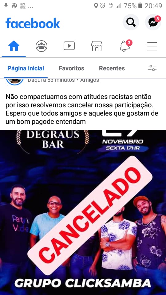 A repercussão, entretanto, ganhou as redes socias. O vereador eleito Ramon Faustino (Psol) foi um dos que se manifestou. Pelas redes sociais, declarou repúdio ao que classificou como racismo. “Esse episódio mostra o racismo declarado! A cultura negra virou negócio, vendável, o capital vende dentro de uma norma, a branca”, disse ele, que comemorou, ainda, o fato de o grupo de pagode ter cancelado o show.