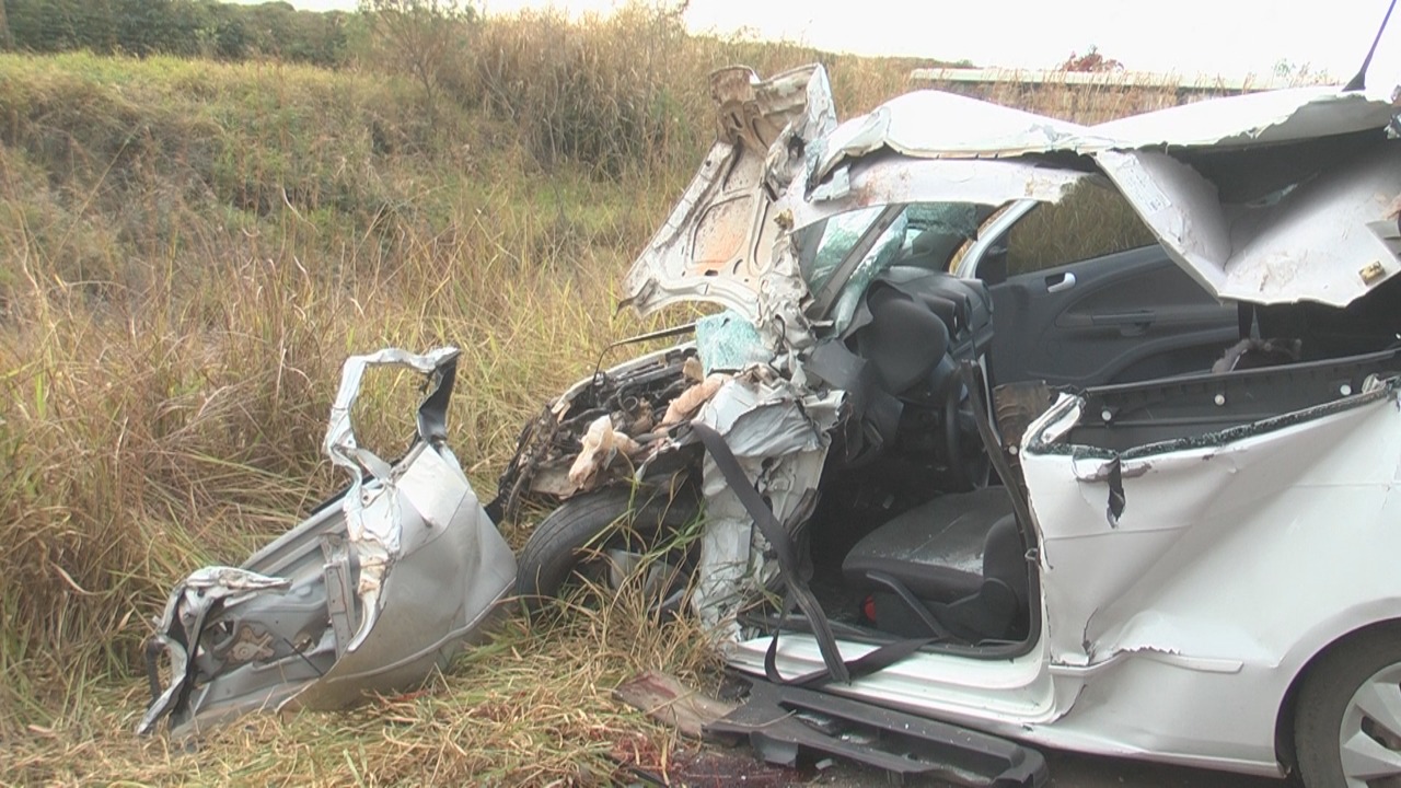 O motorista do VW Gol ficou preso nas ferragens e foi socorrido consciente pelo Corpo de Bombeiros. O estado de saúde dele, que tem 50 anos, é estável, mas inspira cuidados.