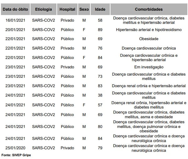 As mortes ocorreram entre os dias 16 e 21 de janeiro e vitimaram 11 homens e três mulheres. O paciente mais novo foi um homem de 38 anos e a mais velha uma mulher de 89 anos. Todas os mortos tinham comorbidades.