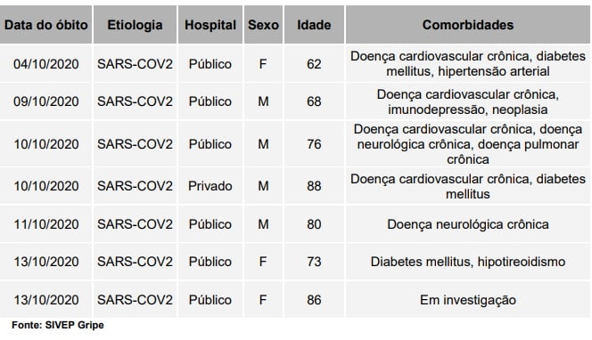 As sete mortes divulgadas nesta quarta ocorreram entre os dias 4 e 13 de outubro. São três mulheres e quatro homens, sendo o paciente mais jovem uma mulher de 62 anos e o mais idoso um homem de 88 anos. Seis pacientes possuíam comorbidades e um caso ainda é investigado.