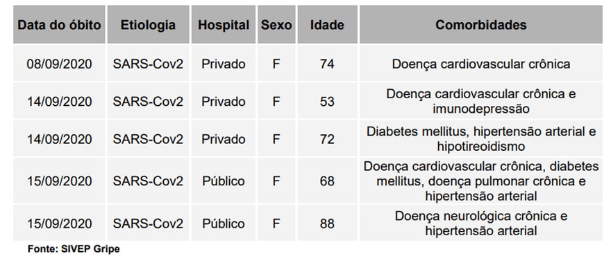 Entre os mortos, todos tinham outras comorbidades. A paciente mais nova tinha 53 anos e a mais idosa, 88 anos.