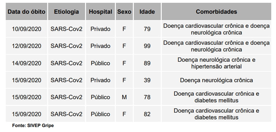 Os óbitos notificados no boletim desta quarta-feira ocorreram entre o dia 10 e 15 de setembro e vitimaram pessoas com comorbidades. O paciente mais novo foi uma mulher de 39 anos e a mais velha, uma mulher de 99 anos.