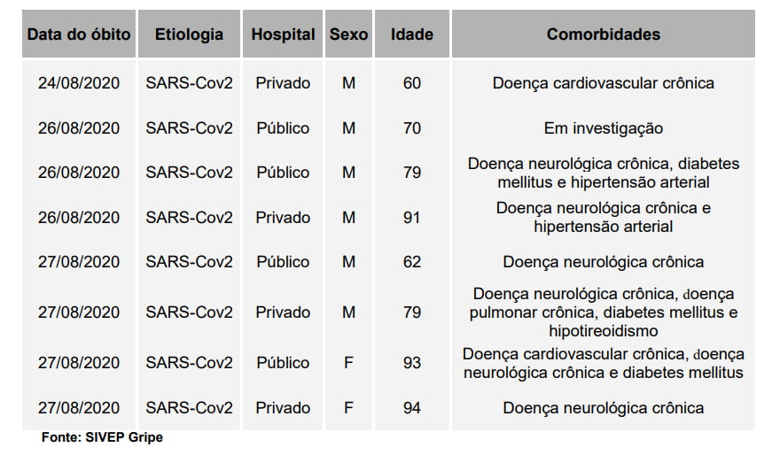 Os óbitos aconteceram entre os dias 24 e 27 de agosto e vitimaram pessoas com idades entre 60 e 94 anos, sendo duas mulheres e seis homens. Desse total, sete tinham comorbidades confirmadas e um caso ainda está sendo investigado. Até o momento, são 559 mortos desde o começo da pandemia na cidade.