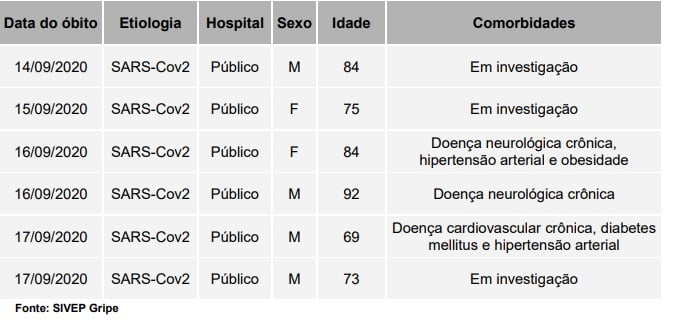 Entre os mortos divulgados nesta sexta, três tinham outras comorbidades e outros três casos estão sob investigação. O paciente mais novo tinha 69 anos e o mais idoso 92 anos.